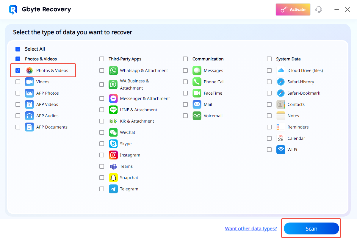 - Select Data Type: Launch the app, choose the type of data you want to restore. (E.g. select “Photos & Videos”).