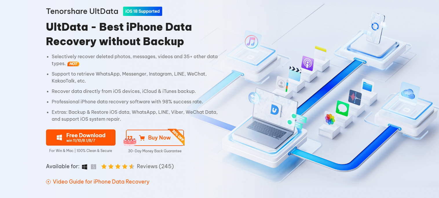 A user-friendly choice for how to recover deleted photos on iPhone, UltData restores images from device storage, iTunes, or iCloud. While slower than Gbyte, its selective preview ensures you only recover what you need.
