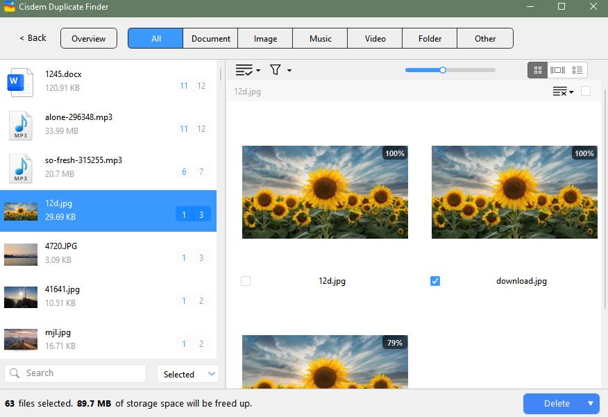 After scanning, it automatically groups the detected duplicates for you to preview. Then, it selects all but one file from each group for deletion, helping you quickly clean up your Downloads folder and free up storage space.