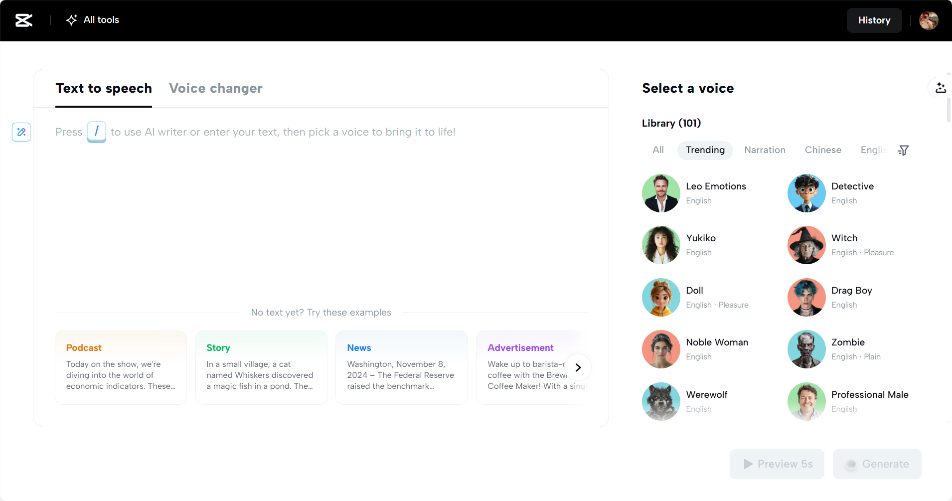 CapCut Web also allows you to explore its voice changer feature. This adds flexibility when adapting tone or character for role-playing, storytelling, or entertainment within learning sessions.
