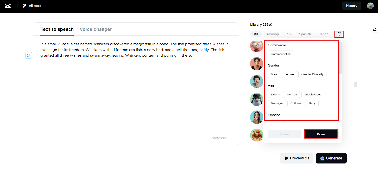 Next, go to the voice settings panel and explore a variety of tones—from friendly and calm to energetic and animated. Use the filters to narrow down voices by gender, language, and clarity. Click “Done” to view a personalized list.