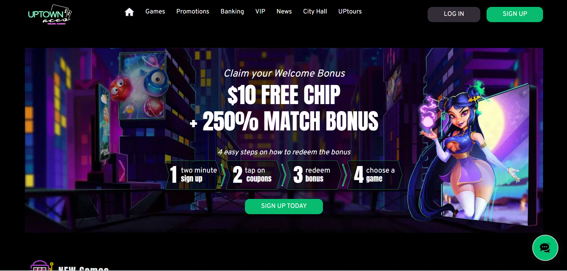 So, a typical welcome package here includes a free chip, usually $10, and a 250% deposit match. That is quite generous, considering you have a whole $10 to use without having to deposit any coins first.